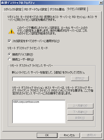 リダイレクト モードのすべての RD 仮想化ホスト サーバーと RD セッション ホスト サーバーに同じライセンス設定を構成できます。
