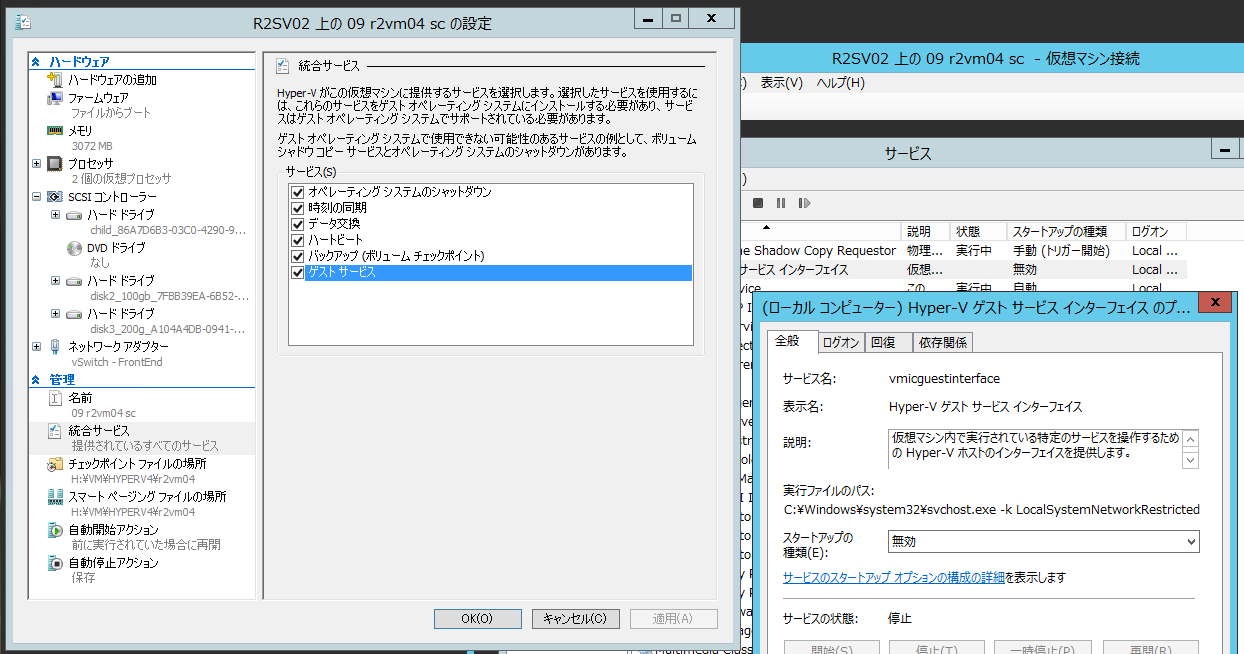 ゲスト サービスは、既定では無効になっていました。これを有効化すると、ゲスト (Windows 7 SP1 で試しました) で Hyper-V ゲスト サービス インターフェイスが開始します。