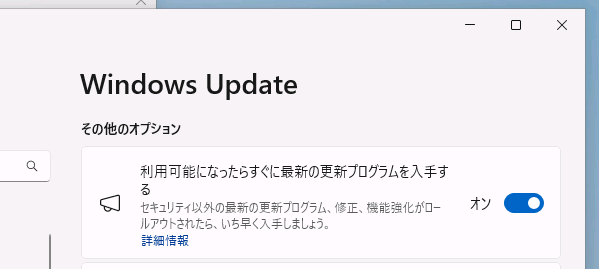 なお、WSUS クライアントだとか、Windows Update 遅延ポリシーだとか、Intune で管理されているデバイスでは、「利用可能になったらすぐに最新の更新プログラムを入手する」トグルスイッチは使用不能(オフの状態)。